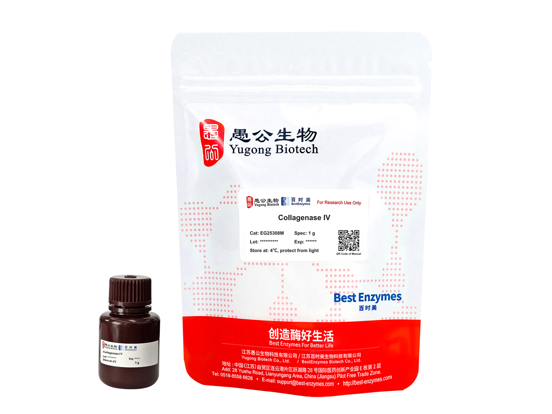 胶原酶(Collagenase)来源于溶组织梭菌(Clostridium histolyticum),是一种蛋白酶,能够特异性的识别Pro-X-Gly-Pro 序列并切割该序列中性氨基酸(X)和甘氨酸(Gly)之间的肽键,并且这种序列在胶原中出现的频率很高。胶原酶是唯一的一种可以降解广泛存在于结缔组织中的具有三股螺旋的天然胶原纤维的蛋白酶。