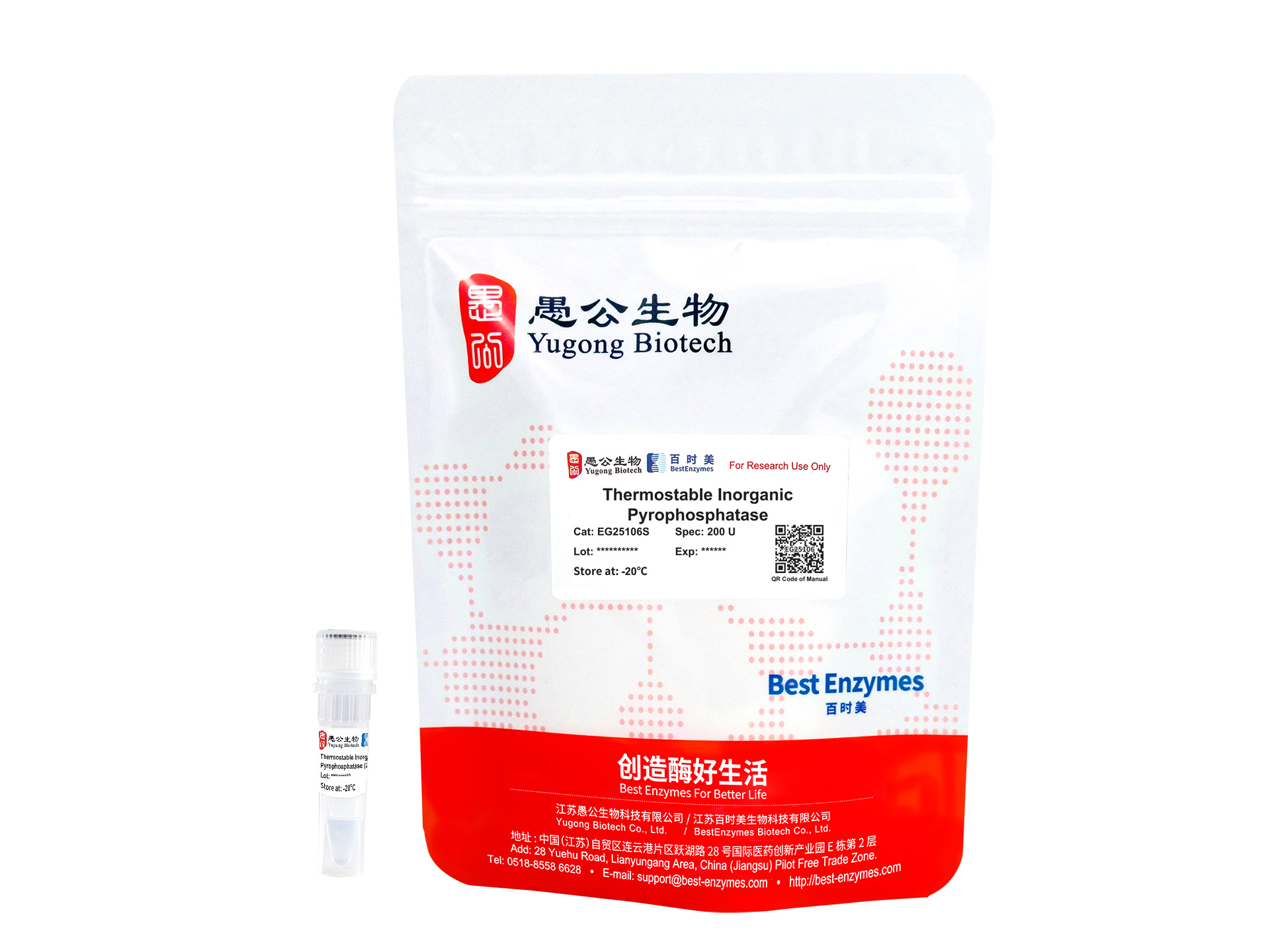 Thermostable Inorganic Pyrophosphatase来源于极端嗜热菌(Thermococcus litoralis),经大肠杆菌重组表达纯化后获得,可催化无机焦磷酸盐水解生成正磷酸盐:P₂O₇⁴⁻ + H₂O + PPase → 2HPO₄²⁻。与Pyrophosphatase, Inorganic (Yeast) (REF:EG23109)相比,本品更加耐热,在100℃加热4 h仍具有100%活性,因此除体外转录以外,还可用于高温的聚合反应,例如PCR、LAMP等。